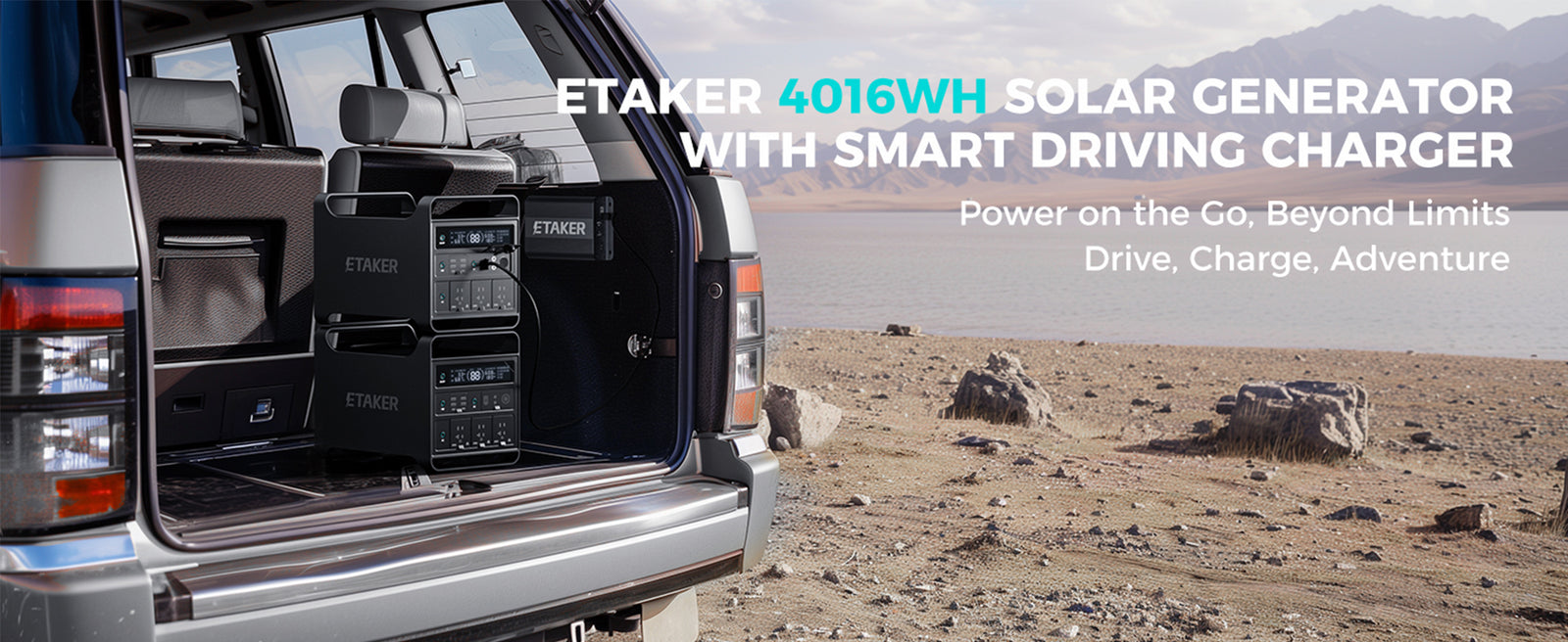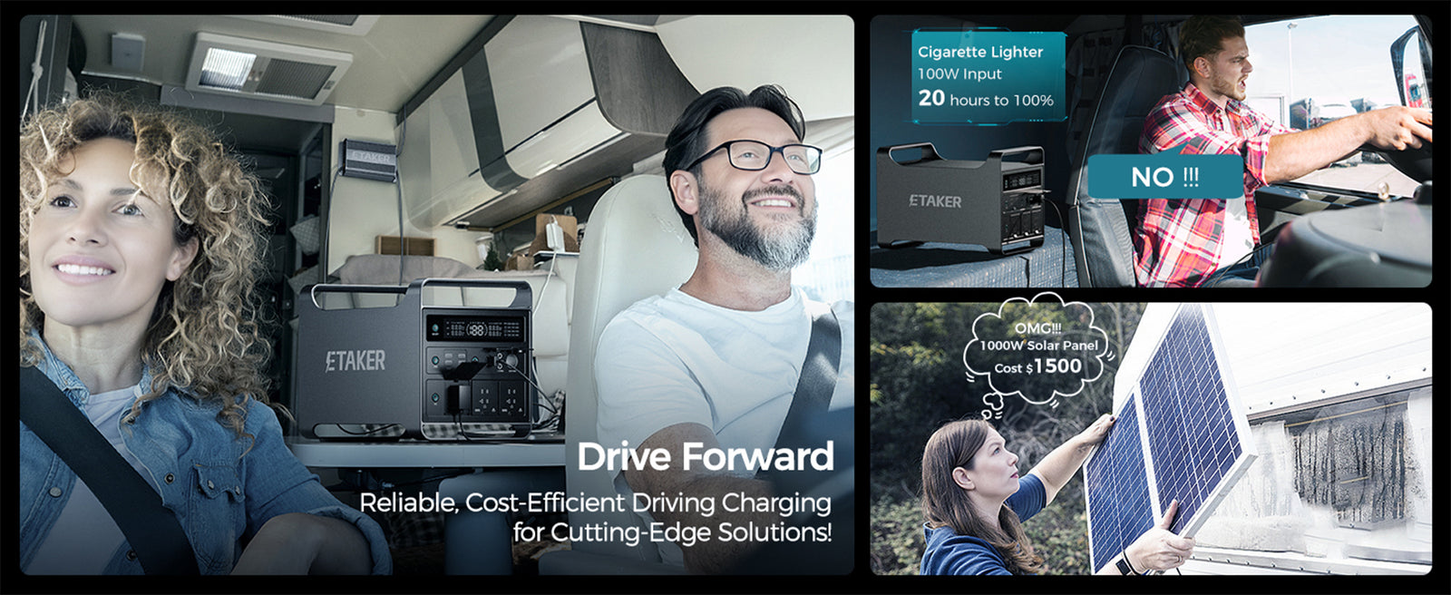 【Supports Fast Charging and Multiple Recharge Methods】 The portable power station achieves 70-80% charge in just 1 hour via AC charging(1200W MAX), reaching a full charge in 2 hours. By combining with 5 Etaker 200W smart MPPT controller solar panels (should purchased separately), it can be fully charged in 2.5 hours. Additionally, our product boasts unique features,supports FLEET1000 Car Fast Charging while driving, achieving a quick full charge in just 2 hours for on-the-go convenience. Also support through wind power(1000W MAX), providing versatile and efficient energy solutions for your camping or family emergency storage full-scenario usage.
