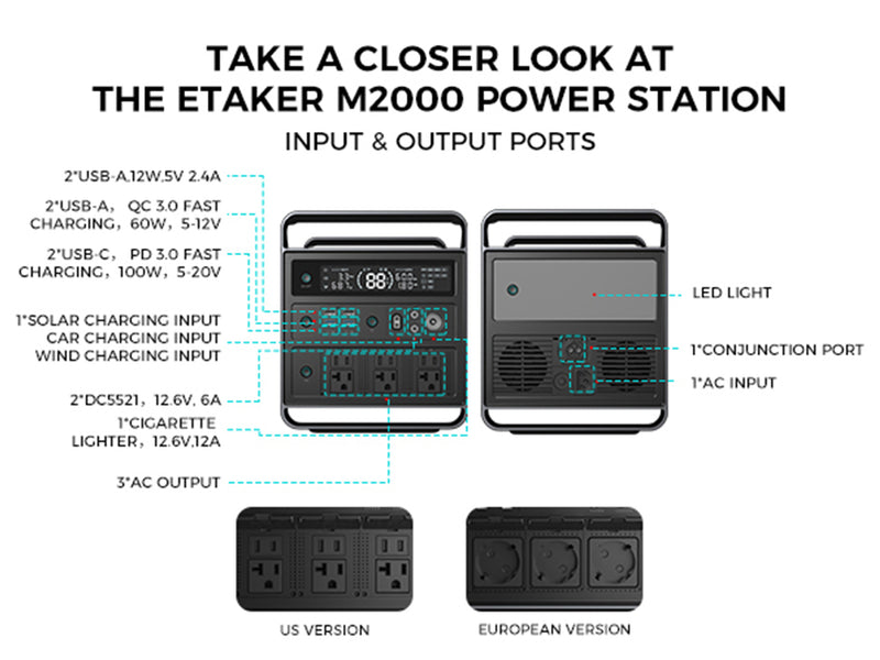 • 【New Electricity Experience】Power up to 30 devices with ease using the versatile 4016Wh portable generator. It boasts 30 outlets, including 8 USB-A (4x12W, 4x60W), 4 USB-C, 12 AC outputs, 4 DC ports, and 2 Cigarette Lighter, accommodating almost all devices with up to 4800W. This multifunctional M2000 offers low heat production and a dual-mode cooling system for optimal performance. With four LED modes (Low/High Brightness/SOS/Flash), plus support for emergency starting of gasoline vehicles, 20ms UPS function, delivering an ultimate user experience. Worry-free 3-Year Warranty.