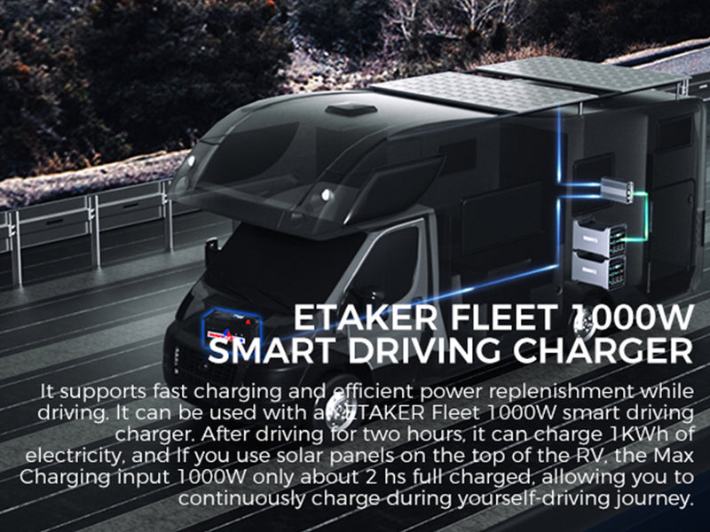 • 【Supports Fast Charging and Multiple Recharge Methods】 The portable power station achieves 70-80% charge in just 1 hour via AC charging(1200W MAX), reaching a full charge in 2 hours. By combining with 5 Etaker 200W smart MPPT controller solar panels (should purchased separately), it can be fully charged in 2.5 hours. Additionally, our product boasts unique features,supports FLEET1000 Car Fast Charging while driving, achieving a quick full charge in just 2 hours for on-the-go convenience. Also support through wind power(1000W MAX), providing versatile and efficient energy solutions for your camping or family emergency storage full-scenario usage.