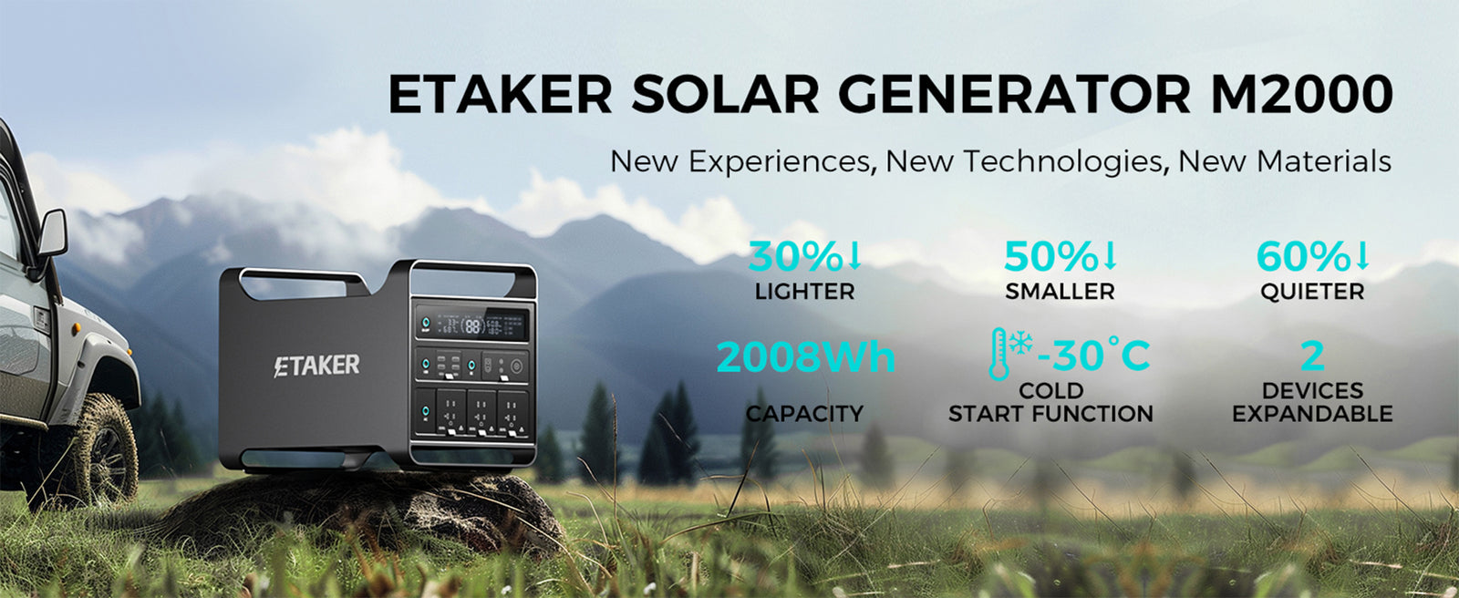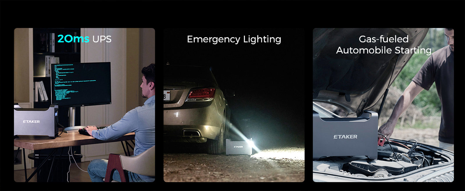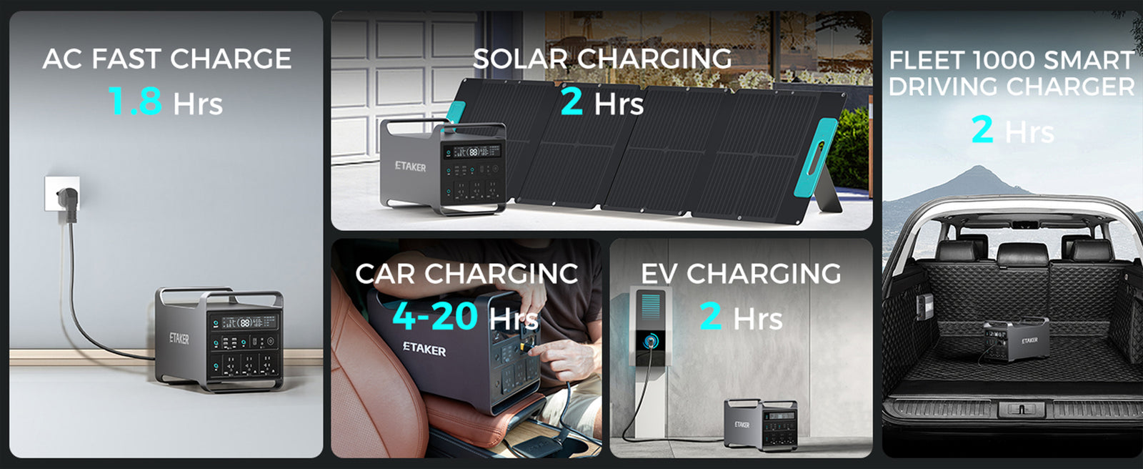- 【Supports Fast Charging and Multiple Recharge Methods】 The portable power station achieves 70-80% charge in just 1 hour via AC charging(1200W MAX), reaching a full charge in 2 hours. By combining with 5 Etaker 200W smart MPPT controller solar panels (should purchased separately), it can be fully charged in 2.5 hours. Additionally, our product boasts unique features,supports FLEET1000 Car Fast Charging while driving, achieving a quick full charge in just 2 hours for on-the-go convenience. Also support through wind power(1000W MAX), providing versatile and efficient energy solutions for your camping or family emergency storage full-scenario usage.