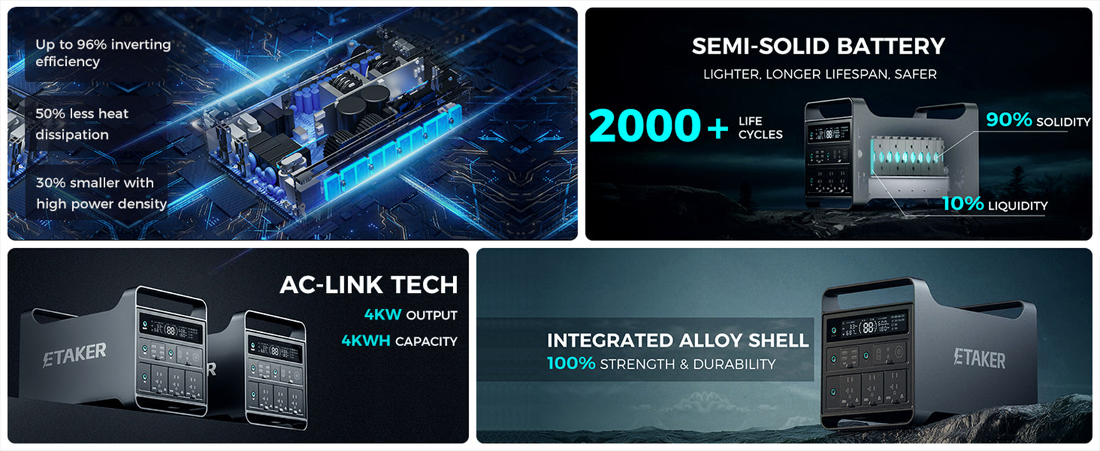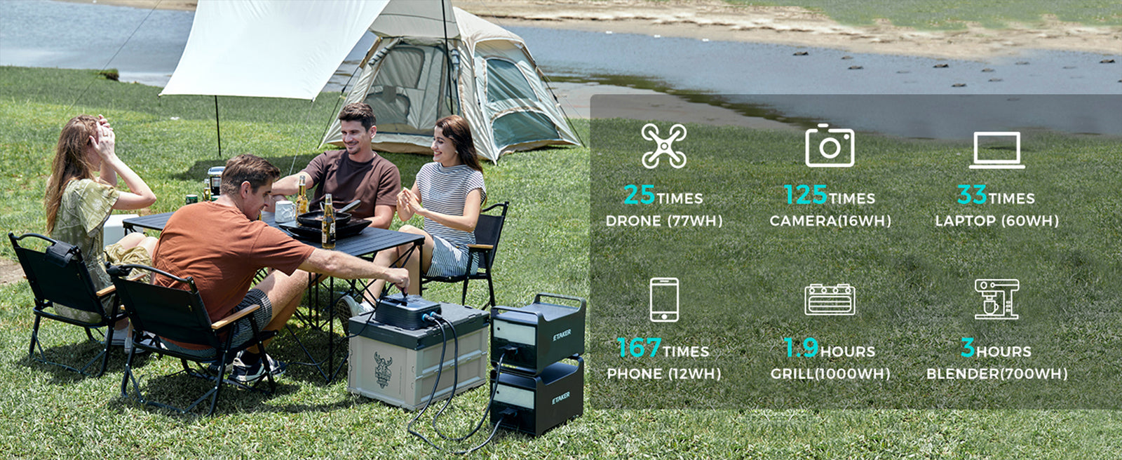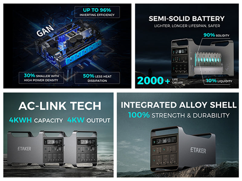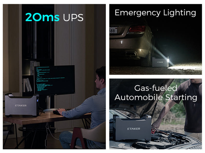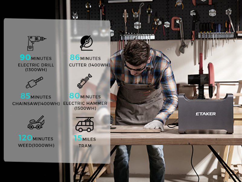 - 【Supports Fast Charging and Multiple Recharge Methods】 The portable power station achieves 70-80% charge in just 1 hour via AC charging(1200W MAX), reaching a full charge in 2 hours. By combining with 5 Etaker 200W smart MPPT controller solar panels (should purchased separately), it can be fully charged in 2.5 hours. Additionally, our product boasts unique features,supports FLEET1000 Car Fast Charging while driving, achieving a quick full charge in just 2 hours for on-the-go convenience. Also support through wind power(1000W MAX), providing versatile and efficient energy solutions for your camping or family emergency storage full-scenario usage.