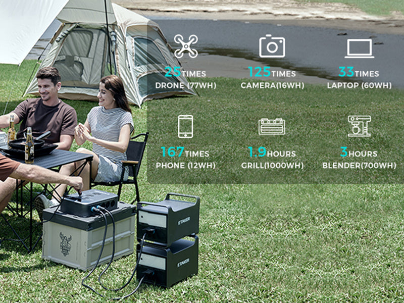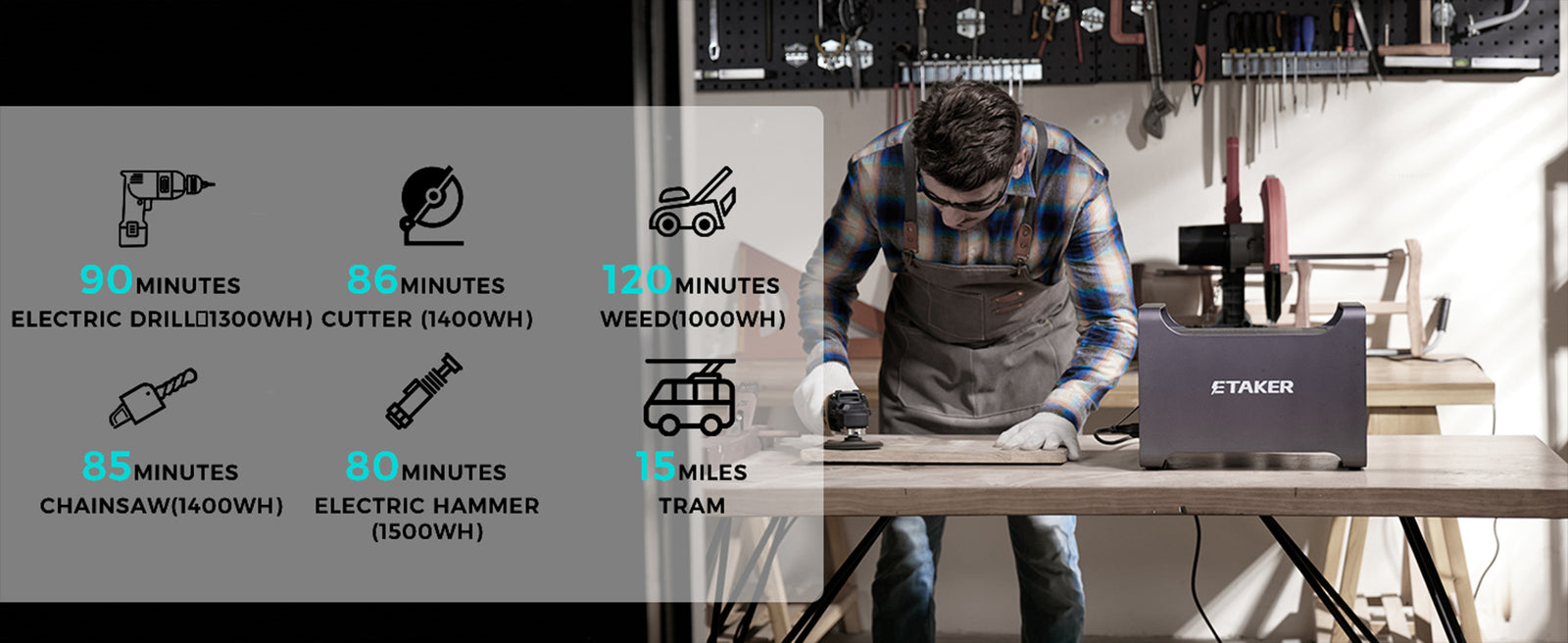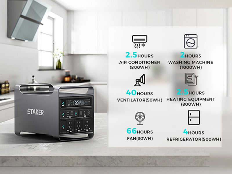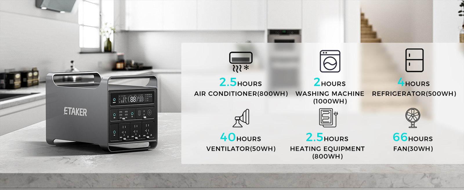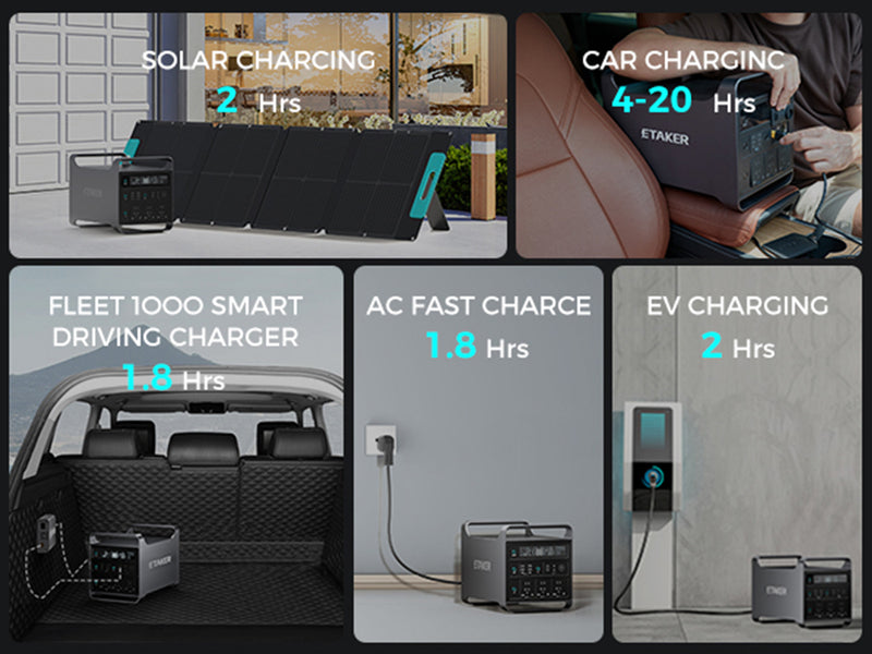 【Supports Fast Charging and Multiple Recharge Methods】 The portable power station achieves 70-80% charge in just 1 hour via AC charging(1200W MAX), reaching a full charge in 2 hours. By combining with 5 Etaker 200W smart MPPT controller solar panels (should purchased separately), it can be fully charged in 2.5 hours. Additionally, our product boasts unique features, supporting a full charge in 2.5 hours through wind power(1000W MAX) and 2 hours via a car charging station(1200W MAX), providing versatile and efficient energy solutions for your camping or family emergency storage.