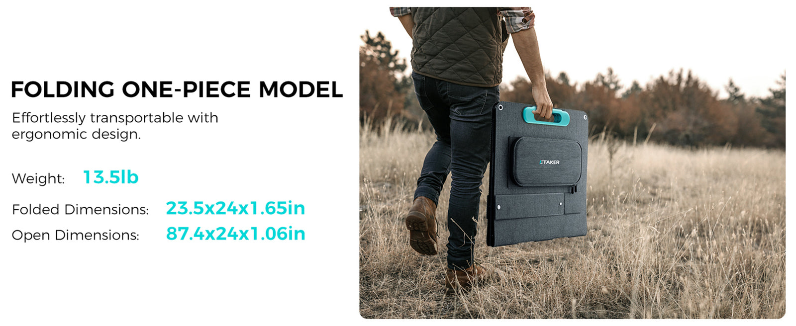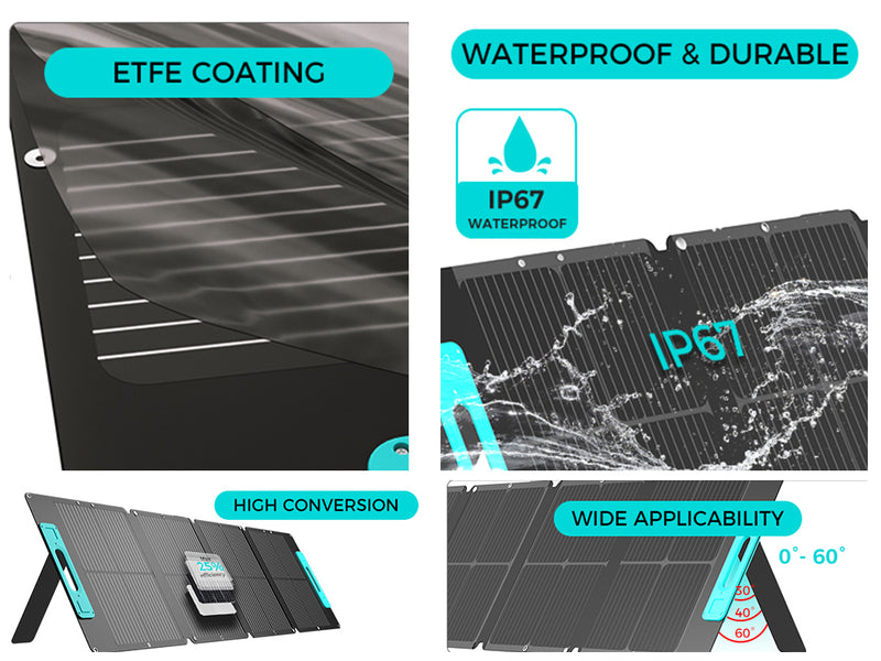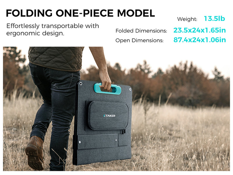 • 【High-Efficiency Conversion】Efficiently charge your devices with this high-performance ETAKER 200W foldable solar panel kit,conversion rate of 25%, perfect for family camping trips and outdoors.